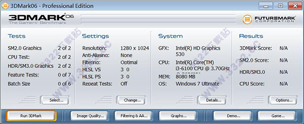 1、启动3DMark06,win7旗舰版用户需要选择运行3DMark06中的哪些内容来进行测试。单击主界面上“Tests”模块中的“Select”按钮,弹出“SelectTests”项目,然后选择所需测试的场景。一般情况下,勾选测试 “SM2.0 Graphics Tests” 场景和 “HDR/SM3.0 Graphics Tests”场景,及“CPUTests”测试