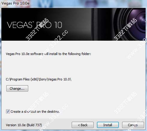 4、选择Vegas Pro 10.0的安装路径,可默认或直接点击Change更改路径,并同时勾选“Create a shortcut on the desktop”在桌面上创建一个快捷方式,完成点击Install