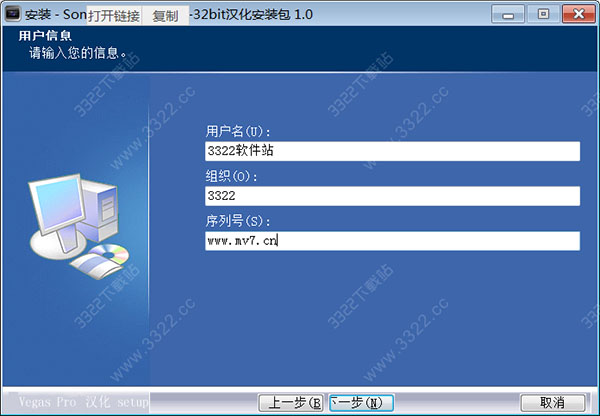 8、阅读软件汉化安装包信息,小编建议选择3322,并输入汉化补丁的序列号www.mv7.cn,点击next进行汉化