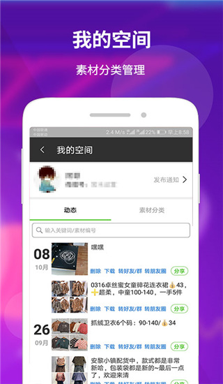 可保存好友发布的素材到自己的素材空间,可保存自己的素材到自己的素材空间,非常方便实用。
