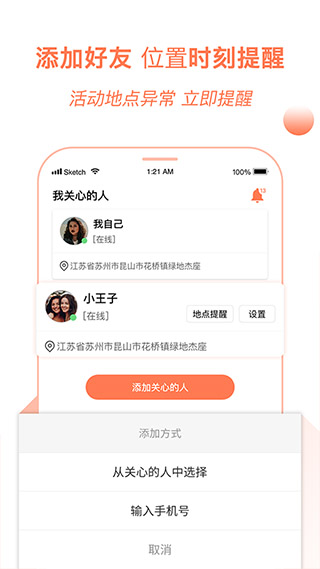 2、添加好友,位置时刻提醒,活动地点异常,立即提醒