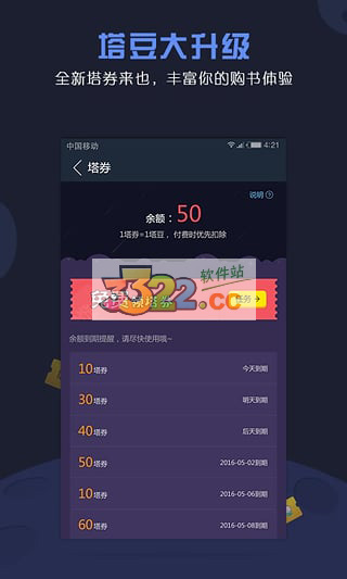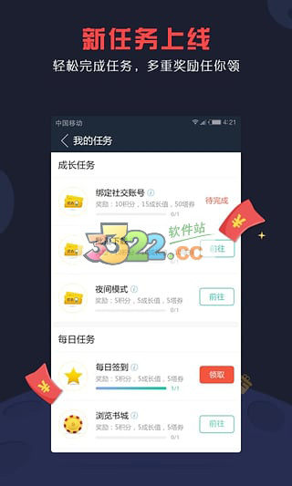我的任务是app自带的帮助用户获得塔券的一个特色小功能,用户可以通过任务来赚取塔券,塔券可以用来追新正版热门书籍,各种正版书籍免费看,塔读文学app的塔券不仅可以通过任务获得,每天的签到也同样可以获得大量的塔券,如果用户一周满签以及一月满签更有满签大礼包等你拿。除此之外,你还可以获得积分,在积分商城中你可以兑换多重豪礼,除了塔券,还有各种实体书、周边等等物品等你来兑换。