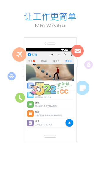 【工作应用】:解决企业日常办公需求,如考勤、签到、审批、日志、公告、请假、报销、出差等,同时全面支持接入企业自定义应用,让工作更简单!