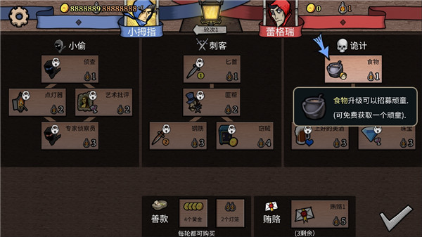 2、灯笼消费:顽童,帮派,暴徒,头领行动力优先购买,艺术评论家,窃贼,珠宝没什么用,不要买