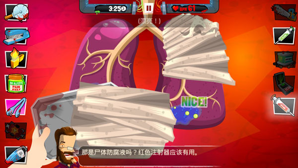 3、游戏为玩家们提供了十二中手术器械,包括披萨刀、订书机、打火机、镊子、电锯等等,这些东西在现实中肯定是无法作为手术器材的