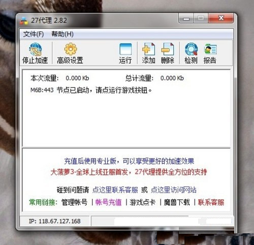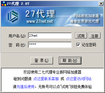 27代理是一款非常有年代的老牌著名网络游戏加速器,27代理的功能非常的强大,通过网络代理,实现游戏、软件等等降低网络延迟的功能,支持应用、游戏代理,均可实现网络的加速、降低延迟的效果,27代理集成了服务器列表,具备自动更新和网络检测的功能,常用于网络游戏的加速。27代理是最早作为魔兽加速器,可以极大地改善魔兽世界的数据传输效率。由此可见,27加速器在游戏加速器的领域具有一定的地位,27加速器起源于清华大学27号楼,伴随魔兽世界而生,是最早专门针对魔兽世界的网络加速器。在魔兽世界加速方面积累了长达6年的经验,率先使用企业专线带宽为魔兽加速。27加速器的特色是速度快、服务器多、分布范围广,支持同时加速几个不同的游戏。提供魔兽世界官网下载分流,最新的升级补丁,团队语音加速等服务。27代理采用了Ultimate Ping技术,通过优化传输数据,让使用者能明显的感觉到ping值的降低,同时通过PreRouting技术,通过专用的高速通道,从游戏服务器接收数据,转发给玩家的电脑,完成加速功能。并且这款代理软件,适用于各种需要网络的情况,电信、网通、教育网、铁通、移动和其他类型的宽带用户都可以获得不同程度的加速效果,在使用上,这款网络代理软件服务周到,使用起来不限时间,不限地点,一个代理账号在所有的服务器上都可以使用。