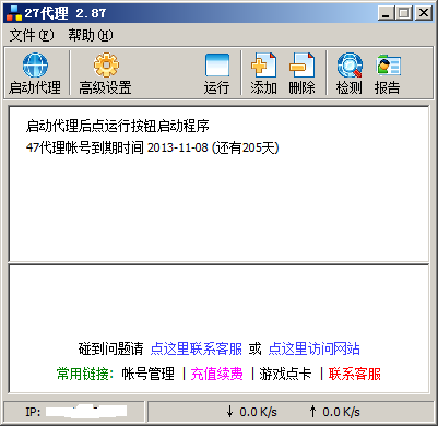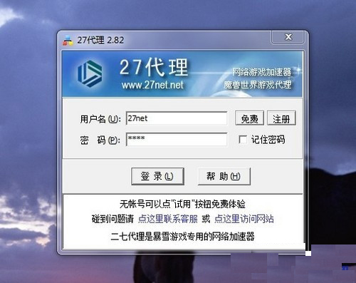 打开27代理,会弹出登录界面。没有帐号不用在意,点击右侧的“免费”按钮,系统会自动填入免费账号和密码,然后再进行登录就可以了。
