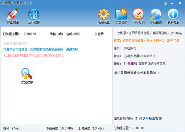 27代理游戏加速器虽然很不错,但是有的用户接受不了这款加速器收费,所以小编今天为大家带来了27代理破解版,可无限试用,无需充值,相信你们肯定在苦苦寻找,赶紧下载体验无限试用的快感吧。