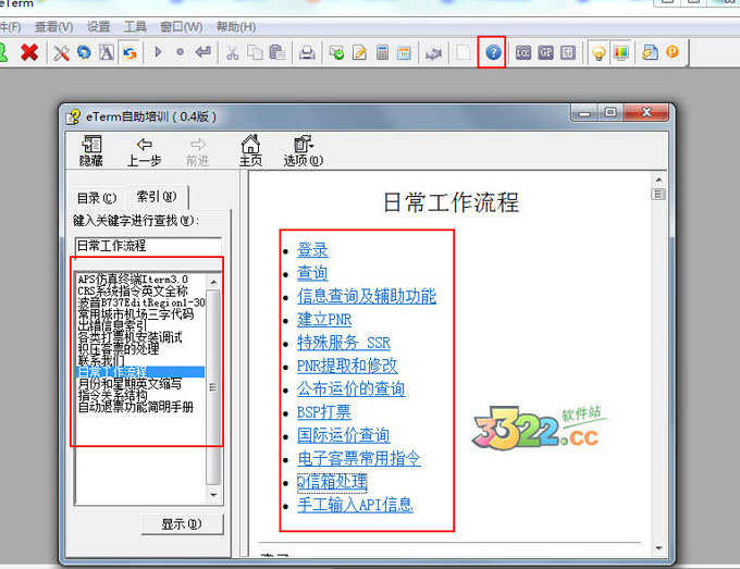 在使用eterm过程中有任何疑问可以点击这个“?”图标,这是一个自主培训文件,里面有很多详细操作代码,积压客票处理问题,国内外航空代码等的解答,非常全面,遇上难题,可以很方便地在这查询。