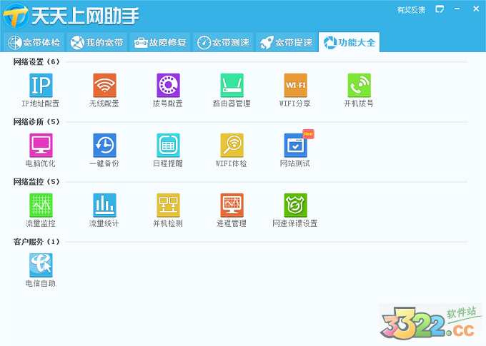 6、功能大全 彩虹上网助手在这里为大家提供了其他一些的上网工具,例如电脑优化、流量监控、wifi体检等等