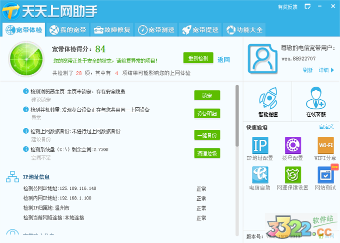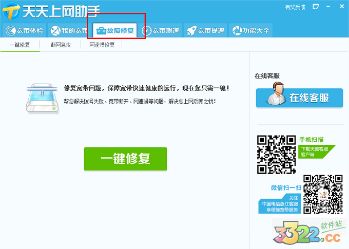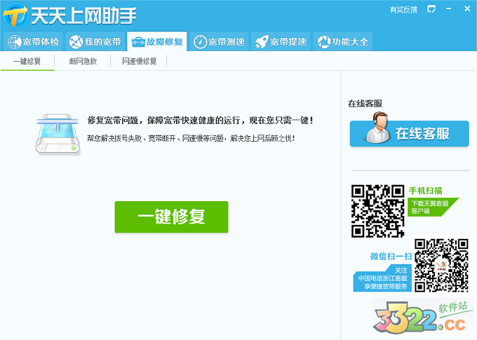 1、宽带体检 可以检测出用户的宽带是否安全,然后根据相应的检测给与一个修复的方案,用户只需点击修复即可