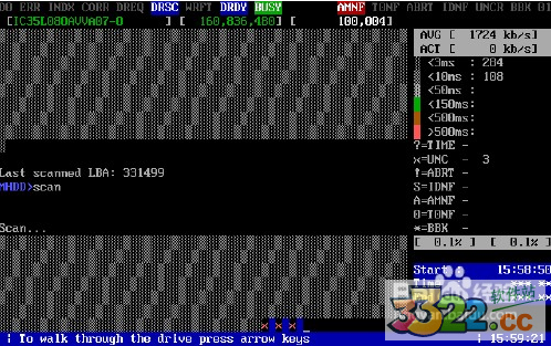 4:我们可以利用软件扫描下看坏道的情况,按两下F4软件自动检测(这过程不会改变任何状态)遇到坏道便会用红X标出来