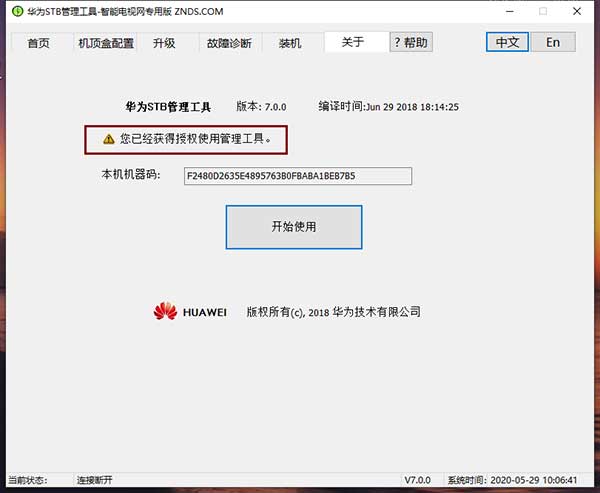 3、再点击关于按钮,就会发现我们已经授权使用华为STB管理工具了。