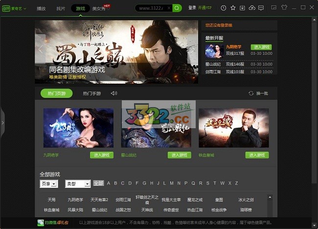 爱奇艺pps影音为用户提供了诸多好玩的页游和手游哦,以此用户可以边看电影边玩游戏。最为重要的是,用户使用这个客户端登陆到游戏当中,还有着额外的游戏奖励哦。还在等什么,九阴绝学、铁血皇城等诸多热门的页游在等着你来玩哦