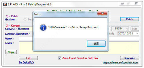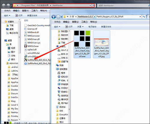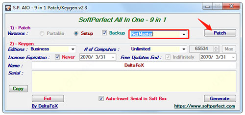7、双击打开“SoftPerfect_AIO_9in1_Patch_Keygen_v2.3_By_DFoX.exe”选择软件版本为“NetMaster”单击Patch;