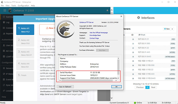 5、至此,cerberus ftp server Enterprise 11破解版成功激活,用户可以无限制免费使用。
