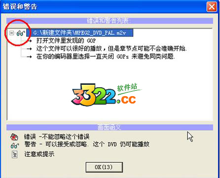 用DVDlab PRO导入视频文件时,常常出现下面这个错误和警告对话框,提示在编码时需关闭GOP
