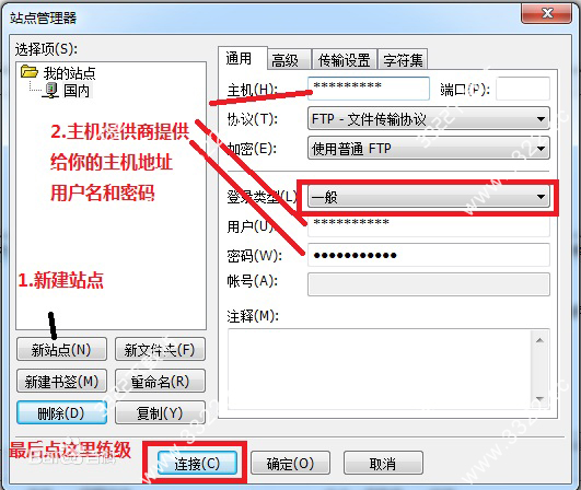 1、先双击打开软件,点击站点管理-新建站点-把空间提供商或者你自己创建的FTP的主机名,用户名,密码输入上去,并且点击连接即可进入【默认保存密码下次直接点击连接即可】