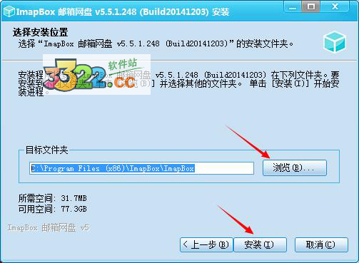 4、软件默认的安装路径是C:Program Files (x86)ImapBoxImapBox,如需安装到其他盘符下请点击“预览”,选后路径后点击确定,然后点击“安装”。