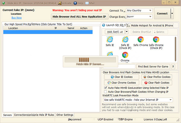 3.连接到隐藏所有IP服务器,然后按“隐藏浏览器和所有新应用程序IP”按钮。