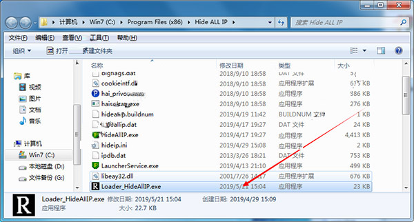 5、之后将Loader_HideAllIP.exe破解补丁移动复制到软件安装目录位置中,以管理员身份运行,注意以后使用的时候始终通过“Loader_HideAllIP.exe”作为管理员运行程序