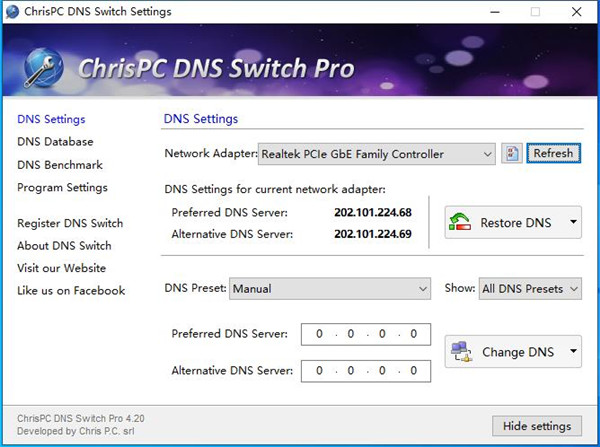 通过在其DNS数据库中安装所有这些预设服务器组,ChrisPC DNS Switch可让您自由地管理属于运行Windows的PC /笔记本电脑的所有网络适配器的DNS设置