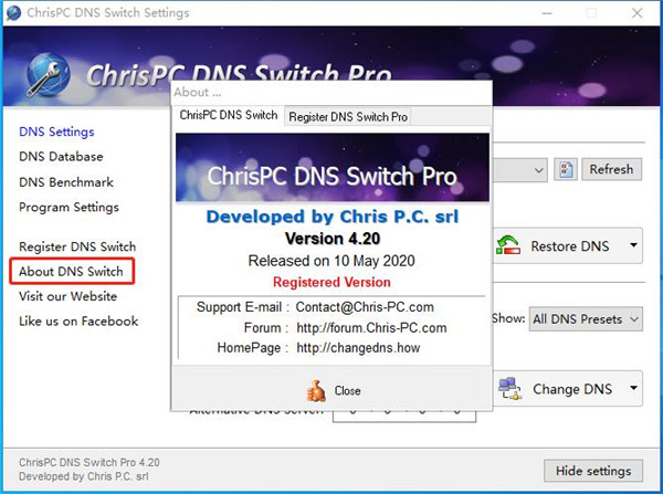8、双击打开软件,点击About DNS Switch,如下图即为破解完成,可以放心使用软件