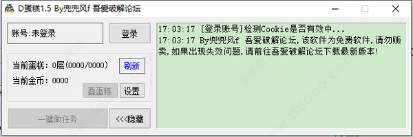 D蛋糕为接下来的京东618活动中叠蛋糕或懂来准备的一款辅助工具,是由吾爱破解的兜兜风F大神自制分享的,绿色小巧,安全无毒,并还是免费无广告的,可随意使用。它能够为用户快速帮助用户完成京东618叠蛋糕活动任务软件使用起来非常的简单,主需要见得登录操作就可以自动完成任务。同时并为了防止京东发现你使用了作弊的手动,还可自定义是儿子随机延时时间以及执行次数,十分强大。欢迎有需要的朋友下载使用。