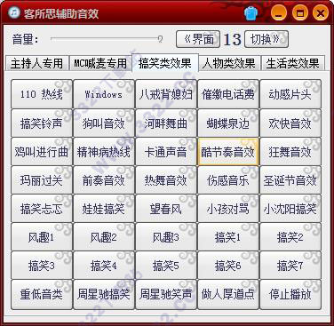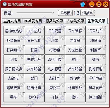 客所思辅助音效是一款用于播放各种搞笑声音的校工具,可用于各大直播平台的直播活动,如YY、熊猫、斗鱼等等。程序拥有主持人、MC喊麦、搞笑类、人物类及生活类五种类型搞笑效果,可播放斗地主胜利、乌鸦飞过、女骚麦、女人呻吟、爆笑声、心跳声、男孩哭声、精神病热线、110热线、打架现场、直升飞机等等百余种声音效果,绝对可满足用户对于声音的任何需要。此外,客所思辅助音效的界面还拥有多种颜色可供选择,包括蓝色、绿色、红色、黑色等,且同时使用也极其方便,双击即可听到任何您想要的声音。
