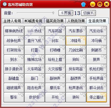 多种搞笑的生活类声音效果,包括精神病热线、110热线、打架现场、直升飞机、火灾报警、敲钟声、手枪声音等